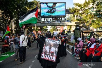 Massa dari Aliansi Bela Palestina Boikot Israel melakukan aksi di halaman pusat perbelanjaan Bandung Indah Plaza (BIP), Bandung, Jawa Barat, Sabtu (13/7/2024). Dalam aksinya mereka mendesak kepada pemerintah Indonesia untuk mendukung kemerdekaan Palestina serta mengajak masyarakat memboikot produk yang berafiliasi dengan Israel. ANTARA FOTO/Raisan Al Farisi/aww.