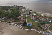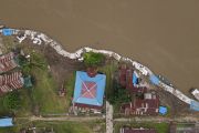 Foto udara susunan karung berisi pasir untuk menahan abrasi sungai Konaweha di Desa Muara Sampara, Kabupaten Konawe, Sulawesi Tenggara, Sabtu (13/7/2024). Balai Wilayah Sungai Sulawesi IV memasang 1.660 karung untuk mencegah abrasi sungai diwilayah tersebut. ANTARA FOTO/Andry Denisah/foc.