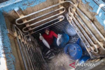 Pekerja memindahkan ikan di gudang penyimpanan berpendingin (cold storage) di fasilitas Cold Storage Kementerian Kelautan dan Perikanan (KKP) di Muara Baru, Jakarta, Senin (15/7/2024). Menteri Kelautan dan Perikanan Sakti Wahyu Trenggono menyatakan target indikator utama produksi perikanan Kementerian Kelautan pada rencana kerja pemerintah atau RKP 2025 sebesar 24,58 juta ton. ANTARA FOTO/Erlangga Bregas Prakoso/rwa.