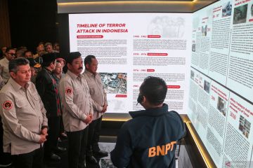 Pengunjung mengamati koleksi sejarah terorisme di Museum Nasional Penanggulangan Terorisme Adhi Pradana yang diresmikan di Sentul, Kabupaten Bogor, Jawa Barat, Selasa (16/7/2024). Museum itu didedikasikan sebagai sarana wisata edukasi untuk terus meningkatkan rasa cinta tanah air dan kesadaran akan bahaya terorisme serta simbol pentingnya kerja sama internasional dalam menghadapi ancaman terorisme. ANTARA FOTO/Yulius Satria Wijaya/foc.