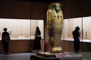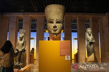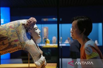 Seorang pengunjung mengamati sebuah topeng wajah mumi wanita yang ditampilkan dalam pratinjau pameran bertajuk "Di Puncak Piramida: Peradaban Mesir Kuno" (On Top of the Pyramid: The Civilization of Ancient Egypt) di Museum Shanghai, Shanghai, China timur, Rabu (17/7/2024). Pameran akan dibuka untuk umum pada Jumat (19/7) dengan menampilkan 788 artefak berharga dari berbagai periode Mesir kuno dan sebagian besar artefak tersebut untuk pertama kalinya dipamerkan di Asia . ANTARA FOTO/Xinhua/Liu Ying/tom.