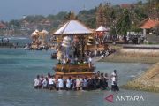 Upacara ngaben massal di Nusa Penida Bali. Sejumlah umat Hindu mengarak tempat pembakaran jenazah saat melintasi pantai pada upacara ngaben massal di Desa Adat Karangsari, Nusa Penida, Klungkung, Bali, Kamis (18/7/2024). Upacara ngaben massal tersebut digelar setiap lima tahun sekali dengan berjalan melintasi pantai. ANTARA FOTO/Nyoman Hendra Wibowo/pras.