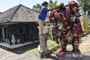 Perajin Ropiana Muntaha, memakai cosplay atau kostum robot di Rumah Produksi Cosmake heroic, Desa Maparah, Kecamatan Panjalu, Kabupaten Ciamis, Jawa Barat, Minggu (21/7/2024). Berawal pengamen jalanan cosplay superhero di Bandung, Ropiana Muntaha memproduksi kostum robot karakter Hulkbuster, Bumblebee, Transformer dan Optimus Prime yang dijual mulai Rp6,5 juta hingga Rp8 juta dan banyak diminati untuk dijadikan pajangan toko serta pernah diekspor ke Malaysia, Qatar, dan Kuwait. ANTARA FOTO/Adeng Bustomi/rwa.