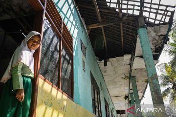 Seorang siswa menanti jam belajar di ruangan kelas yang rusak di MIS Al-Khaeriyah, Cisoka, Kabupaten Tangerang, Banten, Selasa (23/7/2024). Sekolah gratis yang mengampu 93 siswa dengan empat ruang kelas tersebut mengalami kerusakan di bagian atap sejak empat tahun lalu dan membutuhkan bantuan renovasi agar tidak membahayakan siswa saat mengikuti kegiatan belajar. ANTARA FOTO/Sulthony Hasanuddin/YU
