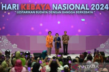Presiden Joko Widodo (kanan) bersama Ibu Negara Iriana Joko Widodo (tengah) selaku penerima penghargaan Ibu Bangsa didampingi Ketua Umum Ketua Umum Kongres Wanita Indonesia (Kowani) Giwo Rubianto Wiyogo berfoto bersama dalam peringatan Hari Kebaya Nasional 2024 di Istora Senayan, Jakarta, Rabu (24/7/2024). Kegiatan yang mengangkat tema "Lestarikan Budaya dengan Bangga Berkebaya" tersebut diharapkan dapat mendorong lebih banyak perempuan di Indonesia untuk mengenakan kebaya. ANTARA FOTO/Sigid Kurniawan/tom.