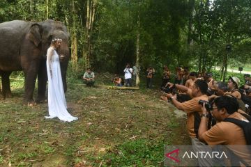 Sejumlah peserta memotret model dengan seekor gajah Sumatera (Elephas maximus sumatrensis) saat roadshow International Animal Photo and Video Competition (IAPVC) 2024 di Baby Zoo, Taman Safari Indonesia, Kabupaten Bogor, Jawa Barat, Sabtu (27/7/2024). Taman Safari Indonesia kembali menggelar ajang kompetisi foto dan video satwa IAPVC 2024 yang telah memasuki tahun penyelenggaraan ke-33 dengan tujuan mengedukasi sekaligus menanamkan kepedulian kepada masyarakat untuk berkontribusi dalam melindungi satwa serta habitatnya. ANTARA FOTO/Arif Firmansyah/tom.