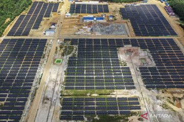 Foto udara Pembangkit Listrik Tenaga Surya (PLTS) IKN di Penajam Paser Utara, Kalimantan Timur, Kamis (1/8/2024). PLTS IKN yang saat ini telah beroperasi dengan kapasitas 10 MW itu akan memasok 100 persen kebutuhan listrik untuk upacara peringatan HUT Ke-79 RI di IKN. ANTARA FOTO/Hafidz Mubarak A/aww.