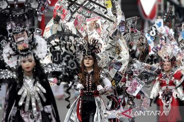 Peserta mengikuti Jember Fashion Carnaval (JFC) ke-22 di Jember, Jawa Timur, Minggu (4/8/2024). Karnaval JFC bertema "Algorithm" dengan tagline "Beyond Binary of Our Story" yang menempuh rute sepanjang 3,6 km tersebut menampilkan 10 defile, yaitu wayang, chess, versailles, media, betta fish, climate change, zodiac, fairy, Jember, dan defile rio. ANTARA FOTO/Umarul Faruq/Spt.