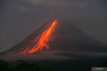 Luncuran guguran lava pijar Gunung Merapi terlihat dari Turi, Sleman, DI Yogyakarta, Senin (5/8/2024) malam. Menurut data BPPTKG periode pengamatan 5 Agustus 2024 pukul 00.00 - 24.00 WIB telah terjadi 55 kali guguran lava dengan jarak luncur maksimal 1.700 meter ke arah barat daya dan menunjukkan suplai magma masih terus berlangsung sehingga dapat memicu terjadinya awan panas guguran dari Gunung Merapi yang berstatus siaga (level III). ANTARA FOTO/Hendra Nurdiyansyah/foc.