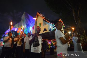 Peserta membawa miniatur rumah Gadang saat mengikuti pawai Telong-telong di Padang, Sumatera Barat, Selasa (6/8/2024). Pawai yang menampilkan lampion tradisional dengan berbagai bentuk dan miniatur itu digelar dalam rangka HUT ke-355 kota Padang dan diikuti ratusan peserta dari berbagai kecamatan. ANTARA FOTO/Iggoy el Fitra/pras.