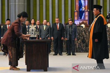 Deputi Gubernur Senior Bank Indonesia Destry Damayanti (kanan) mengucapkan sumpah jabatan saat pelantikannya di Mahkamah Agung, Jakarta, Rabu (7/8/2024). Deputi Gubernur Senior Bank Indonesia periode 2019-2024 itu resmi menjabat kembali menjadi Deputi Gubernur Senior Bank Indonesia periode 2024-2029. ANTARA FOTO/Fauzan/Spt.