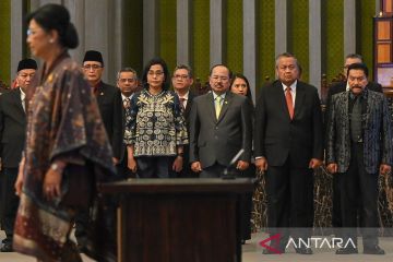 Menteri Keuangan Sri Mulyani (keempat kanan), Gubernur Bank Indonesia Perry Warjiyo (kedua kanan), Mantan Kepala BIN AM Hendropriyono (kanan), Ketua KY Amzulian Rifai (ketiga kiri) menghadiri pengucapan sumpah jabatan Deputi Gubernur Senior Bank Indonesia Destry Damayanti di Mahkamah Agung, Jakarta, Rabu (7/8/2024). Deputi Gubernur Senior Bank Indonesia periode 2019-2024 itu resmi menjabat kembali menjadi Deputi Gubernur Senior Bank Indonesia periode 2024-2029. ANTARA FOTO/Fauzan/Spt.