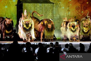 Seniman menampilkan kesenian Barong Ngelawang saat pembukaan Festival Indonesia Bertutur 2024 di Gianyar, Bali, Rabu (7/8/2024). Kegiatan yang diselenggarakan Kementerian Pendidikan, Kebudayaan, Riset, dan Teknologi itu melibatkan sekitar 900 seniman dari 15 negara yang menampilkan 100 karya seni pada 7-18 Agustus 2024. ANTARA FOTO/Fikri Yusuf/tom.