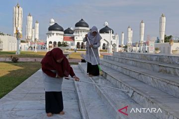 Warga dan anggota Satuan Kerja Perangkat Aceh (SKPA) membersihkan lingkungan objek wisata religi Masjid Raya Baiturrahman saat aksi Jumat Bersih di Banda Aceh, Aceh, Jumat (9/8/2024). Pemprov Aceh mengerahkan seluruh SKPA dan masyarakat di daerah itu melaksanakan gotong royong serentak setiap Jumat untuk membersihkan lingkungan kota dan penataan sejumlah objek wisata dalam rangka menyambut PON XXI Aceh-Sumut. ANTARA FOTO/Ampelsa/tom.