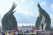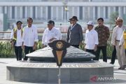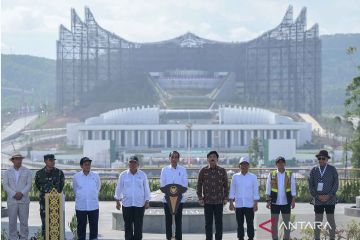Presiden Joko Widodo (kedua kiri) didampingi Menteri PUPR Basuki Hadimuljono (kedua kiri), Mensesneg Pratikno (ketiga kanan), Menko Polhukam Hadi Tjahjanto (kedua kanan), Wakil Menteri ATR/BPN Raja Juli Antoni (kiri), Kurator Pembangunan IKN Ridwan Kamil (kanan), Perancang Istana Garuda IKN Nyoman Nuarta (keempat kiri) meninjau Taman Kusuma Bangsa saat peresmian di Ibu Kota Nusantara (IKN), Penajam Paser Utara, Kalimantan Timur, Senin (12/8/2024). Taman Kusuma Bangsa dirancang sebagai tempat renungan suci dan penghormatan kepada para pahlawan bangsa. ANTARA FOTO/Fauzan/nym.