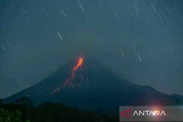 Foto multiple exposure guguran lava pijar Gunung Merapi di Sleman, D.I Yogyakarta, Rabu (14/8/2024). Menurut data BPPTKG periode pengamatan 14 Agustus 2024 pukul 00.00 - 24.00 WIB Gunung Merapi yang berstatus siaga (level III) itu mengalami 27 kali guguran lava pijar dengan jarak luncur maksimal 1.600 meter ke arah barat daya. ANTARA FOTO/Andreas Fitri Atmoko/tom.