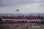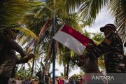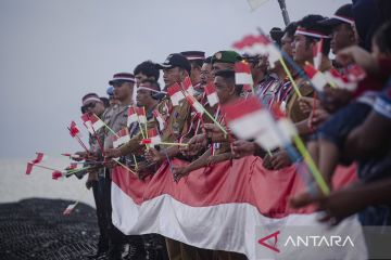 Sejumlah personil Kepolisian, TNI dan sejumlah instansi mengibarkan bendera Merah Putih di Pulau Pelampong, Batam, Kepulauan Riau, Kamis (15/8/2024). Pengibaran bendera Merah Putih di pulau kecil terluar yang berbatasan langsung dengan perairan Singapura tersebut dalam rangka menyambut dan menyemarakkan HUT ke-79 Kemerdekaan RI. ANTARA FOTO/Teguh Prihatna/rwa.