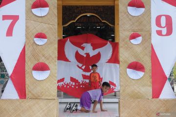 Dua anak bermain di area gapura yang dihias dengan nuansa merah putih untuk dilombakan di Banjar Kedaton, Desa Sumerta Kelod, Denpasar, Bali, Jumat (16/8/2024). Kegiatan lomba menghias balai banjar atau tempat berkumpul warga tersebut digelar untuk memperingati Hari Ulang Tahun (HUT) ke-79 Kemerdekaan Republik Indonesia sekaligus menumbuhkan jiwa nasionalisme kepada generasi muda. ANTARA FOTO/Nyoman Hendra Wibowo/foc.