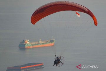 Penerbang mengibarkan Bendera Merah Putih dengan latar kapal tongkang, di perairan Teluk Bayur Padang, Sumatera Barat, Minggu (18/8/2024). Roehana Project bersama Trend Asia mengibarkan bendera merah putih dan spanduk raksasa di sepanjang pesisir kota Padang dalam rangka memperingati Hari Ulang Tahun (HUT) ke-79 Kemerdekaan RI sekaligus kampanye untuk mengingatkan masyarakat bahwa tidak ada kemerdekaan di udara yang tercemar dan mereka ingin udara bersih serta transisi energi yang berkeadilan. ANTARA FOTO/Iggoy el Fitra/nym.