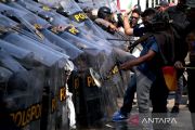 Pengunjuk rasa berupaya menerobos barikade Polisi saat simulasi pengamanan Pilkada di area Stadion Pakansari, Kabupaten Bogor, Jawa Barat, Senin (19/8/2024). Simulasi yang melibatkan personel gabungan TNI/Polri, Satpol PPP dan sejumlah unsur itu digelar Polres Bogor untuk meningkatkan kemampuan personel pengamanan serta mengantisipasi potensi gangguan keamanan jelang penyelenggaraan Pilkada 2024. ANTARA FOTO/Yulius Satria Wijaya/Spt.