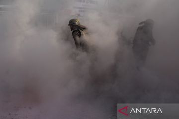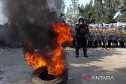 Polisi memadamkan api pada ban yang dibakar pengunjuk rasa saat simulasi pengamanan Pilkada di area Stadion Pakansari, Kabupaten Bogor, Jawa Barat, Senin (19/8/2024). Simulasi yang melibatkan personel gabungan TNI/Polri, Satpol PPP dan sejumlah unsur itu digelar Polres Bogor untuk meningkatkan kemampuan personel pengamanan serta mengantisipasi potensi gangguan keamanan jelang penyelenggaraan Pilkada 2024. ANTARA FOTO/Yulius Satria Wijaya/Spt.