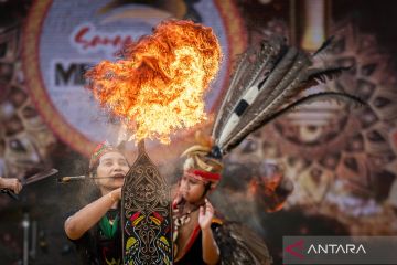 Penari menampilkan Tari Mandau Talawang pada Meratus Geopark Great Culture Carnival di halaman Perkantoran Gubernur Kalsel, Banjarbaru, Kalimantan Selatan, Selasa (20/8/2024). Pemerintah Provinsi Kalimantan Selatan berhasil mencatatkan rekor Museum Rekor Indonesia (MURI) kain khas Banjar yaitu sasirangan terpanjang di dunia yang di bentang sepanjang 5,7 kilometer pada kegiatan Meratus Geopark Great Culture Carnival. ANTARA FOTO/Bayu Pratama S./wpa.