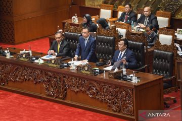 Dua anggota DPR duduk di antara kursi-kursi kosong saat sidang paripurna di Gedung Parlemen, Jakarta, Kamis (22/8/2024). DPR menunda rapat paripurna pengesahan Rancangan Undang-Undang atau RUU Pilkada dan akan menjadwalkan kembali karena jumlah anggota DPR yang hadir tidak kuorum atau hanya 89 orang yang hadir dan 87 orang izin. ANTARA FOTO/Aditya Pradana Putra/aww.