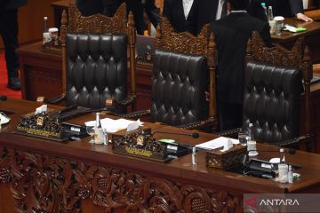 Kursi tiga Wakil Ketua DPR Sufmi Dasco Ahmad (tengah), Lodewijk Freidrich Paulus (kiri), dan Rachmat Gobel (kanan) terlihat kosong usai rapat paripurna ditunda di Gedung Parlemen, Jakarta, Kamis (22/8/2024). DPR menunda rapat paripurna pengesahan Rancangan Undang-Undang atau RUU Pilkada dan akan menjadwalkan kembali karena jumlah anggota DPR yang hadir tidak kuorum atau hanya 89 orang yang hadir dan 87 orang izin. ANTARA FOTO/Aditya Pradana Putra/aww.