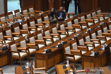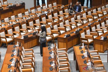 Seorang anggota DPR berdiri di antara kursi-kursi kosong saat sidang paripurna di Gedung Parlemen, Jakarta, Kamis (22/8/2024). DPR menunda rapat paripurna pengesahan Rancangan Undang-Undang atau RUU Pilkada dan akan menjadwalkan kembali karena jumlah anggota DPR yang hadir tidak kuorum atau hanya 89 orang yang hadir dan 87 orang izin. ANTARA FOTO/Aditya Pradana Putra/aww.