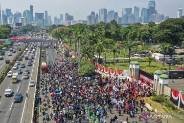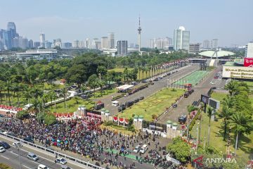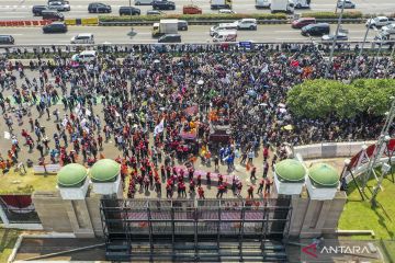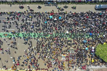 Foto udara massa aksi saat berunjuk rasa menolak pengesahan Revisi UU Pilkada di depan Gedung DPR, Jakarta, Kamis (22/8/2024). Unjuk rasa tersebut merupakan bagian dari gerakan peringatan darurat Indonesia yang viral di media sosial setelah DPR bermanuver mengabaikan putusan MK. ANTARA FOTO/Galih Pradipta/aww.