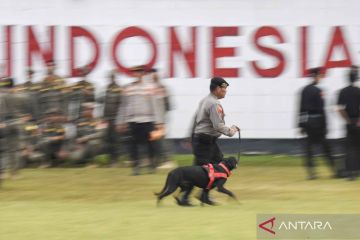 Polisi unit satwa K-9 berlari usai mengikuti gelar pasukan Operasi Mantap Praja Mahakam 2024 di Lapangan Brimob Polda M. Jasin, Balikpapan, Kalimantan Timur, Jumat (23/8/2024). Kegiatan yang diikuti sebanyak 6.284 personel gabungan TNI-Polri hingga instansi terkait tersebut digelar dalam rangka pengamanan Pilkada serentak tahun 2024 di wilayah Provinsi Kalimantan Timur. ANTARA FOTO/M Risyal Hidayat/YU