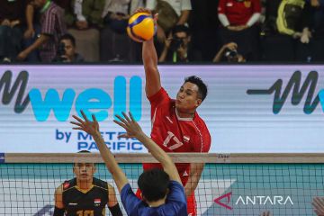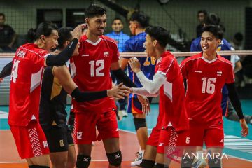 Pevoli Timnas Indonesia melakukan selebrasi usai mencetak skor saat melawan Timnas Filipina dalam kejuaraan voli putra Southeast Asian Volleyball League (SEA V League) 2024 di GOR Universitas Negeri Yogyakarta, Sleman, D.I Yogyakarta, Jumat (23/8/2024). Timnas Indonesia menang atas Filipina dengan skor 3-0 (26-24, 25-11, 25-15). ANTARA FOTO/Andreas Fitri Atmoko/Spt.