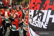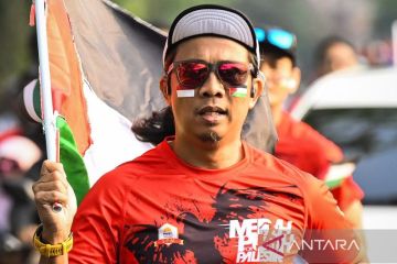 Seorang peserta berlari sambil membawa bendera Palestina saat mengikuti Merah Putih Run for Palestine di Stadion Benteng Reborn, Kota Tangerang, Banten, Minggu (25/8/2024). Ajang lari sejauh 5 km tersebut digelar guna mengumpulkan donasi yang akan disalurkan untuk membantu warga Palestina korban serangan militer Israel. ANTARA FOTO/Sulthony Hasanuddin/Spt.