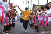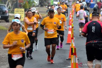 Peserta berlari saat mengikuti Maybank Marathon 2024 di Gianyar, Bali, Minggu (25/8/2024). Lomba lari dengan predikat Elite Label dari World Athletics tersebut diikuti oleh 12.700 orang pelari dari 57 negara. ANTARA FOTO/Fikri Yusuf/aww.