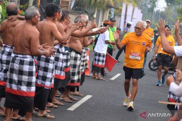Sejumlah penari kecak menyambut peserta Maybank Marathon 2024 di Gianyar, Bali, Minggu (25/8/2024). Lomba lari dengan predikat Elite Label dari World Athletics tersebut diikuti oleh 12.700 orang pelari dari 57 negara. ANTARA FOTO/Fikri Yusuf/aww.