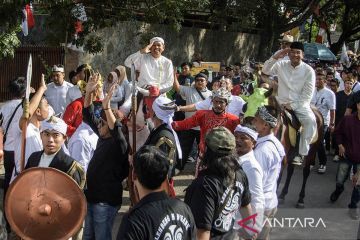 Pasangan bakal calon Gubernur dan Wakil Gubernur Jawa Barat Dedi Mulyadi (kiri) dan Erwan Setiawan (kanan) bersama pendukung menaiki kuda saat pendaftaran di Kantor KPU Jawa Barat, Bandung, Selasa (27/8/2024). Pasangan Dedi Mulyadi dan Erwan Setiawan mendaftarkan diri sebagai peserta Pilgub Jawa Barat 2024 dengan dukungan Partai Gerindra, Partai Golkar, PAN, Partai Demokrat, dan PSI serta sembilan partai lain non parlemen. ANTARA FOTO/Novrian Arbi/rwa.