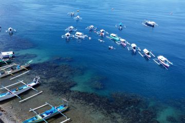Foto aerial sejumlah wisatawan melihat Hiu Paus (Rhincodon Typus) dengan menaiki perahu di objek wisata Hiu Paus Desa Botubarani, Kabupaten Bone Bolango, Gorontalo, Sabtu (31/8/2024). Dinas Pariwisata Provinsi Gorontalo menggelar Festival Hiu Paus untuk pertama kalinya sebagai sarana promosi ekosistem pariwisata yang terintegrasi dengan kelestarian lingkungan berkelanjutan. ANTARA FOTO/Adiwinata Solihin/aww.