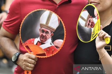 Warga membawa kipas bergambar Paus Fransiskus di depan Gereja Katedral, Jakarta, Rabu (4/9/2024). Kunjungan Pemimpin Takhta Suci Vatikan ke Gereja Katedral tersebut untuk berdialog dengan uskup, imam, diakon, pelaku hidup bakti, seminaris, dan katekis. ANTARA FOTO/Fakhri Hermansyah/Spt/yas