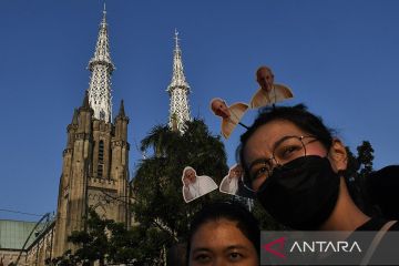 Warga menggunakan bando dengan foto Paus Fransiskus di depan Gereja Katedral, Jakarta,Rabu (4/9/2024). Kunjungan Pemimpin Takhta Suci Vatikan ke Gereja Katedral tersebut untuk berdialog dengan uskup, imam, diakon, pelaku hidup bakti, seminaris, dan katekis. ANTARA FOTO/Fakhri Hermansyah/yas