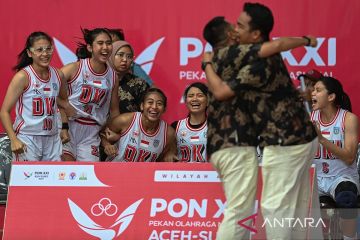 Sejumlah pebasket putri DKI Jakarta melakukan selebrasi saat final 5x5 PON XXI Aceh-Sumut 2024 melawan Jawa Timur di GOR Stadion Harapan Bangsa, Banda Aceh, Aceh, Selasa (10/9/2024). Tim basket putri DKI Jakarta merebut medali emas setelah menang dengan skor 77-56. ANTARA FOTO/Andreas Fitri Atmoko/Spt.