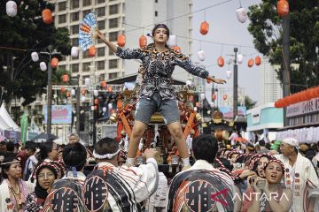 Peserta mengikuti parade mikoshi pada acara Jak-Japan Matsuri 2024 di Plaza Parkir Timur GBK, Jakarta, Sabtu (14/9/2024). Festival budaya Jepang terbesar di Indonesia, Jak-Japan Matsuri yang mengusung tema "Menjelajahi Jepang" itu digelar pada 14-15 September 2024. ANTARA FOTO/Dhemas Reviyanto/Spt.