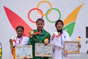 Pelari Jawa Timur Mila Karmila (tengah), pelari Kalimantan Timur Nefriana Ariance (kiri), pelari NTB Dian Ekayanti (kanan) berfoto bersama saat upacara penghargaan pemenang final lari halang rintang 3.000 meter putri PON XXI Aceh-Sumut 2024 di Stadion Madya Atletik Sumut Sport Center, Deli Serdang, Sumatera Utara, Selasa (17/9/2024). Medali emas diraih pelari Jawa Timur Mila Karmila dengan catatan waktu 10 menit 50 detik, medali perak diraih pelari Kalimantan Timur Nefriana Ariance dengan waktu 10 menit 52 detik, dan medali perunggu diraih pelari NTB Dian Ekayanti dengan waktu 10 menit 56 detik. ANTARA FOTO/Fauzan/YU