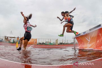 Pelari melakukan lompatan pada final lari halang rintang 3.000 meter putri PON XXI Aceh-Sumut 2024 di Stadion Madya Atletik Sumut Sport Center, Deli Serdang, Sumatera Utara, Selasa (17/9/2024). Medali emas diraih pelari Jawa Timur Mila Karmila dengan catatan waktu 10 menit 50 detik, medali perak diraih pelari Kalimantan Timur Nefriana Ariance dengan waktu 10 menit 52 detik, dan medali perunggu diraih pelari NTB Dian Ekayanti dengan waktu 10 menit 56 detik. ANTARA FOTO/Fauzan/YU
