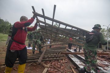 Petugas gabungan TNI, Polri bersama relawan bergotong royong membersihkan bangunan pendopo joglo yang ambruk di Gemblegan, Kalikotes, Klaten, Jawa Tengah, Selasa (24/9/2024). Akibat hujan disertai angin puting beliung pada Senin (23/9) sore mengakibatkan bangunan pendopo joglo yang dikelola oleh BUMDes desa ambruk dan menimpa kendaraan warga. ANTARA FOTO/Aloysius Jarot Nuroho/foc.