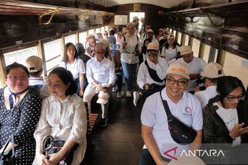 Wisatawan duduk di dalam gerbong saat mengikuti wisata kereta api kuno di Ambarawa, Semarang, Jawa Tengah, Selasa (24/9/2024). Wisata kereta api kuno rute Stasiun Ambarawa - Stasiun Tuntang yang berjarak sekitar 9 kilometer dengan waktu tempuh sekitar satu jam tersebut, wisatawan dikenakan tarif Rp100.000 per orang untuk hari Rabu, Kamis, Jumat dan Rp125.000 per orang untuk hari Sabtu dan Minggu. ANTARA FOTO/Ais Efizudin/Spt.