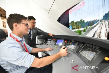 Seorang pengunjung mencoba simulasi mengemudi kereta api berkecepatan tinggi Fuxing di stan China Railway pada International Trade Fair for Transport Technology (InnoTrans 2024) di Berlin, Jerman (24/9/2024). Pameran yang berlangsung selama empat hari tersebut telah menarik lebih dari 2.900 peserta dari 59 negara dengan memamerkan produk dan inovasi terbaru yang mencakup teknologi perkeretaapian, infrastruktur perkeretaapian, transportasi umum, interior, dan konstruksi terowongan di ruang pameran seluas 200.000 meter persegi dan rel sepanjang 3.500 meter. ANTARA FOTO/Xinhua/Ren Pengfei/tom.