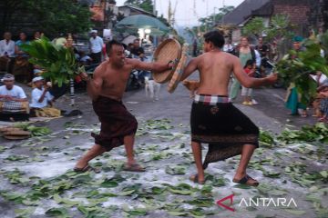 Dua warga saling memukul menggunakan daun langsat dalam tradisi Grudug Langsat pada Hari Raya Galungan di lingkungan Langsat, Desa Rendang, Karangasem, Bali, Rabu (25/9/2024). Tradisi perang dengan bersenjata daun langsat tersebut sebagai simbol kerukunan umat sekaligus perayaan kemenangan dharma (kebaikan) melawan adharma (kejahatan). ANTARA FOTO/Nyoman Hendra Wibowo/tom.