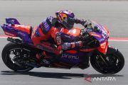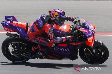 Pembalap Prima Pramac Jorge Martin memacu kecepatan motornya saat mengikuti sesi Kualifikasi 2 MotoGP Mandalika di Pertamina Mandalika International Street Circuit, Lombok Tengah, Nusa Tenggara Barat, Sabtu (28/9/2024). Jorge Martin berhasil meraih pole position disusul pembalap VR46 Marco Bezzecchi dan pembalap GASGAS Tech3 Pedro Acosta. ANTARA FOTO/Akbar Nugroho Gumay/Spt.
