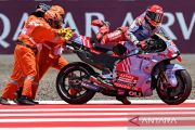 Marshall membantu pembalap Gresini Racing Marc Marquez bangkit usai terjatuh saat sesi kualifikasi 2 MotoGP Mandalika di Pertamina Mandalika International Street Circuit, Lombok Tengah, Nusa Tenggara Barat, Sabtu (28/9/2024). Pembalap Prima Pramac Jorge Martin berhasil meraih pole positiion disusul pembalap VR46 Marco Bezzecchi dan pembalap GASGAS Tech3 Pedro Acosta. ANTARA FOTO/Akbar Nugroho Gumay/Spt.