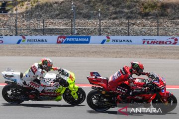 Pembalap Ducati Lenovo Francesco Bagnaia (kanan) memacu kecepatan motornya dibayangi pembalap VR46 Marco Bezzecchi (kiri) saat mengikuti sesi Kualifikasi 2 MotoGP Mandalika di Pertamina Mandalika International Street Circuit, Lombok Tengah, Nusa Tenggara Barat, Sabtu (28/9/2024). Pembalap Prima Pramac Jorge Martin berhasil meraih pole position disusul pembalap VR46 Marco Bezzecchi dan pembalap GASGAS Tech3 Pedro Acosta. ANTARA FOTO/Akbar Nugroho Gumay/Spt.